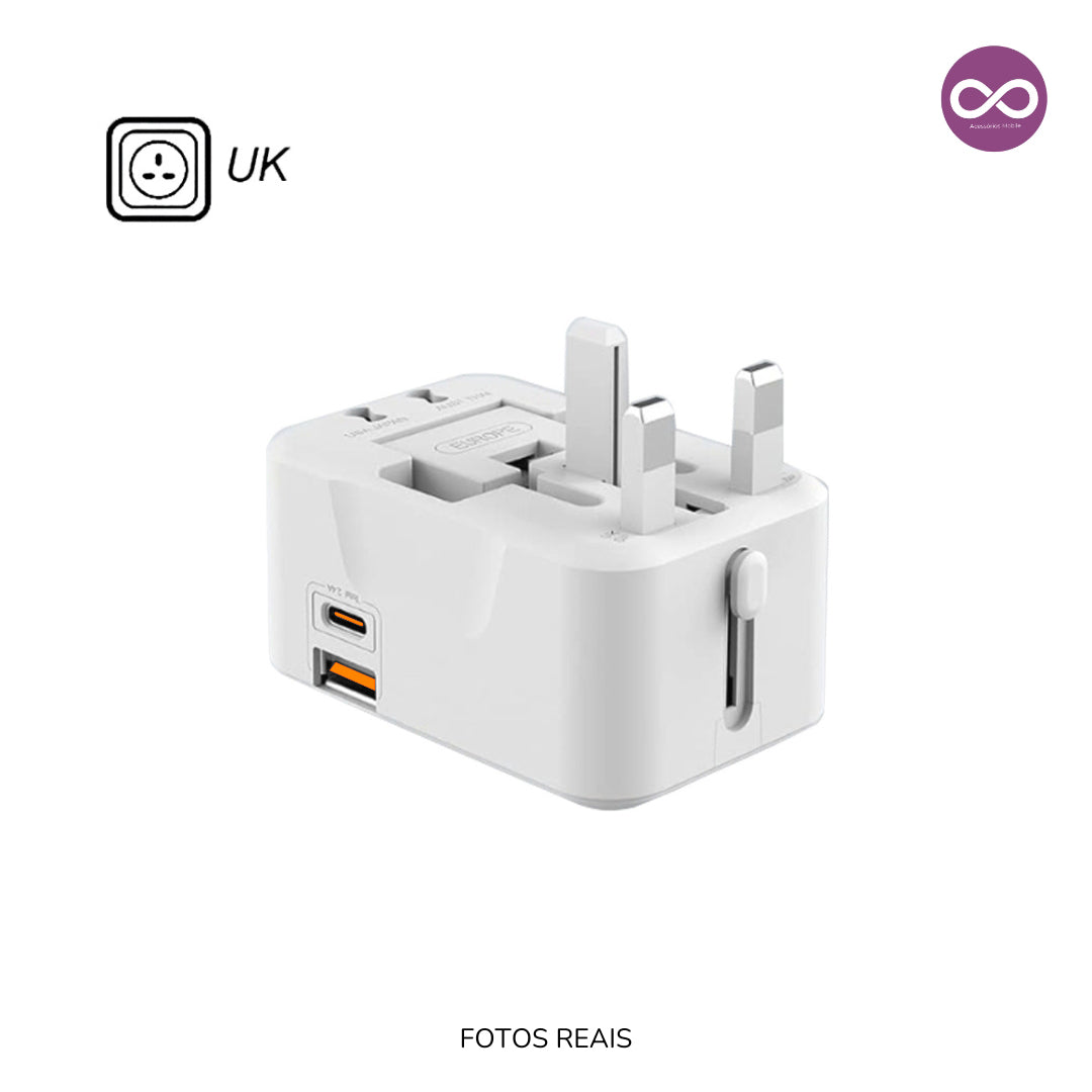 Adaptador Universal Premium Padrão Internacional com Entrada Tipo-C e USB Turbo 20W – Branco