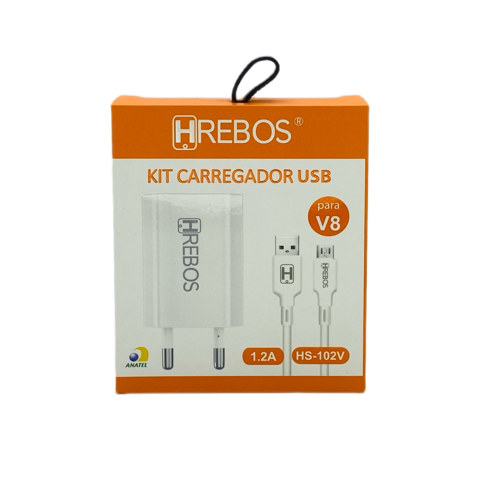 Carregador completo 1.2 A para celulares com entrada Micro USB V8, compatível com Samsung, Xiaomi, Redmi, Motorola, entre outros. Todos os produtos HRebos passam por criteriosos testes de qualidade, garantindo o melhor desempenho e durabilidade Fabricado em plástico.