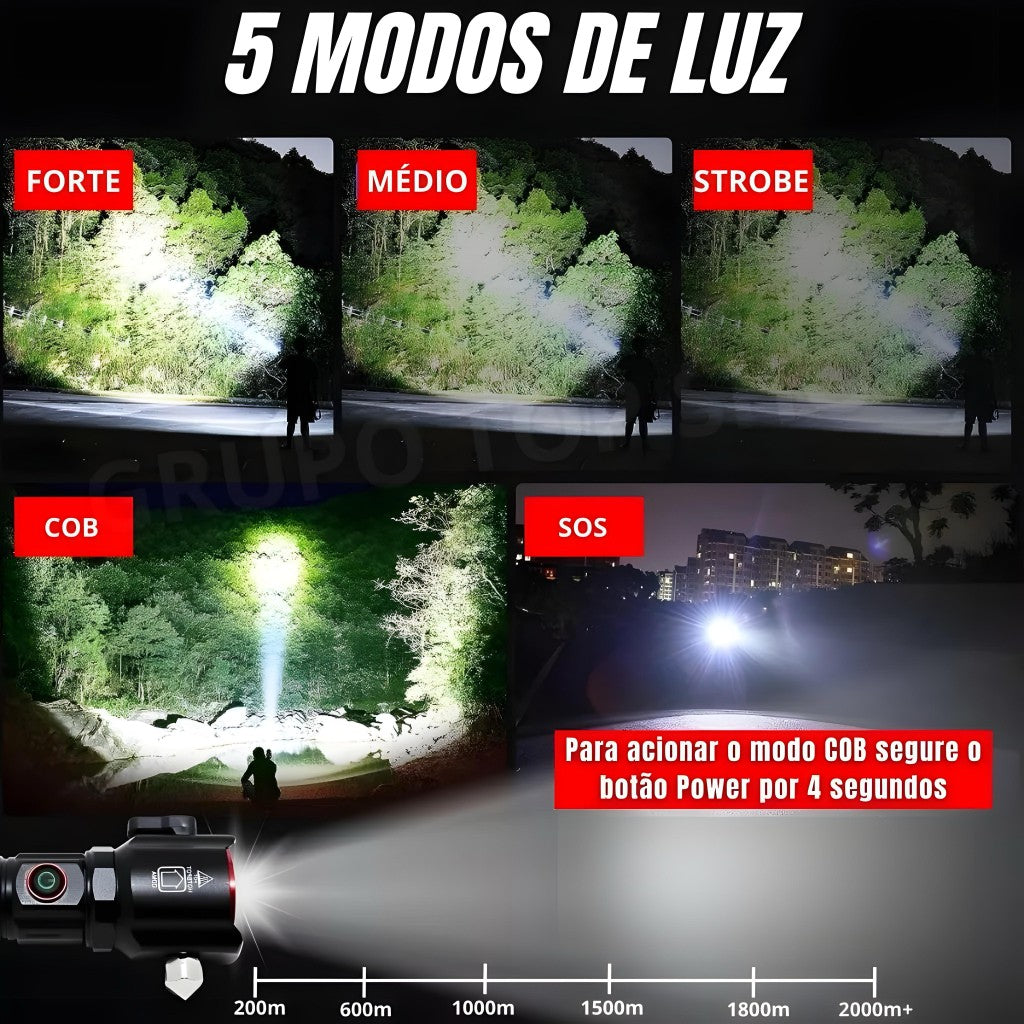Lanterna de longo alcance (até 2000m) com alta potência e foco ajustável para uso em diferentes situações, ferramenta indispensável para quem busca segurança e eficiência em qualquer ambiente.